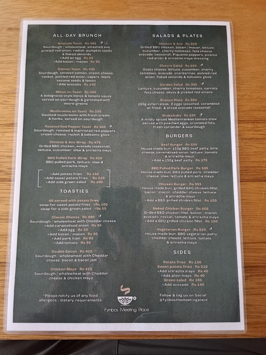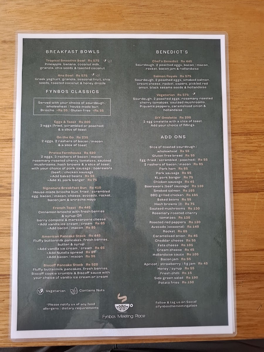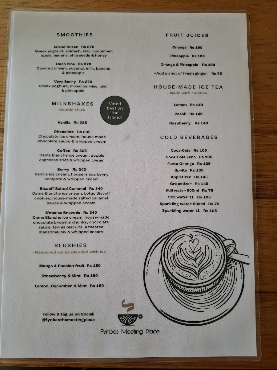 The menu at Fynbos Meeting Place offers a relaxed café-style experience, focusing on simple yet thoughtfully prepared dishes and comforting drinks. It’s the kind of place where you can settle in with a warming cup of coffee or fresh smoothie anytime during the day, whether you’re starting your morning or looking for a light lunch.