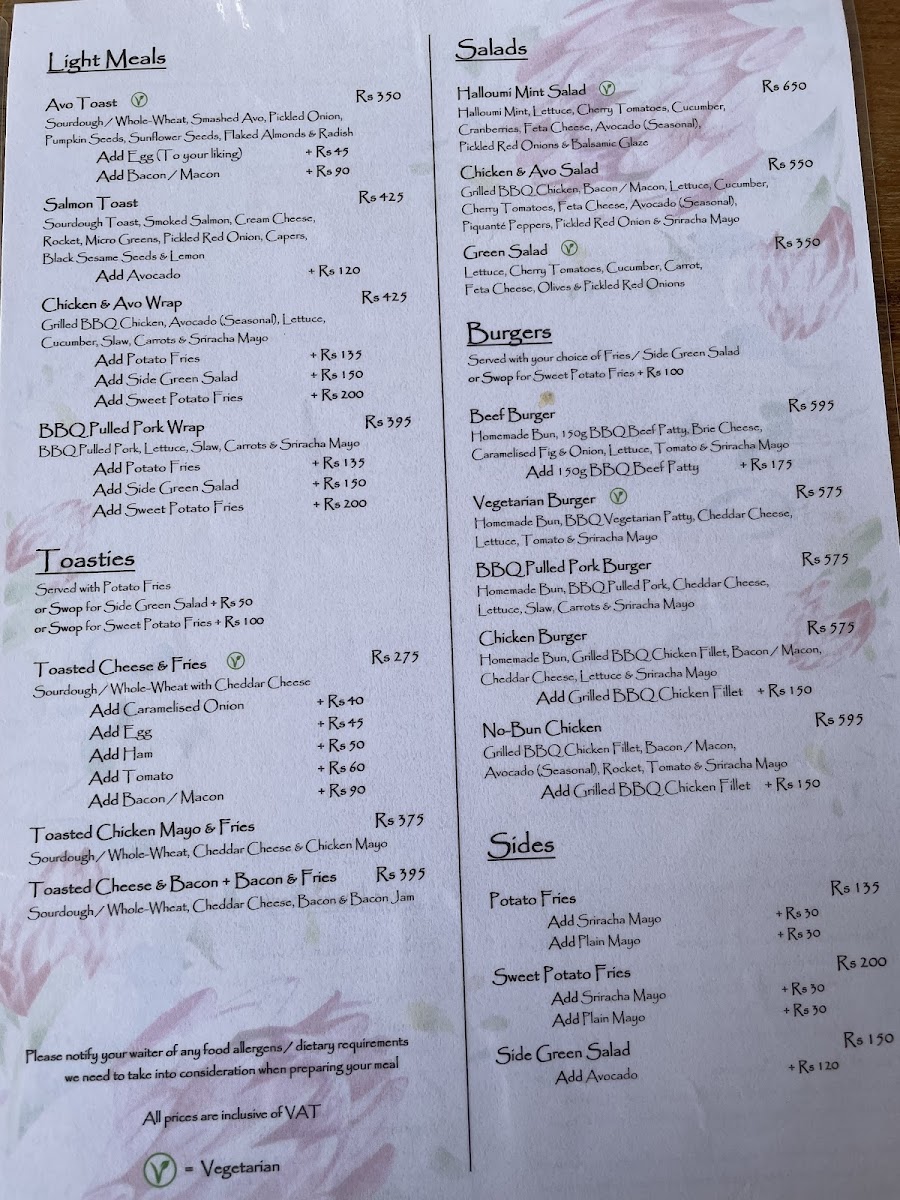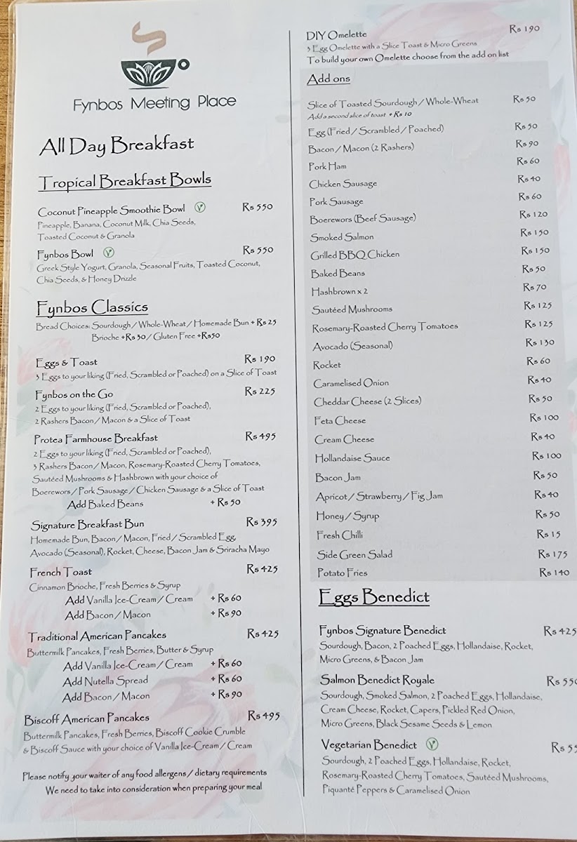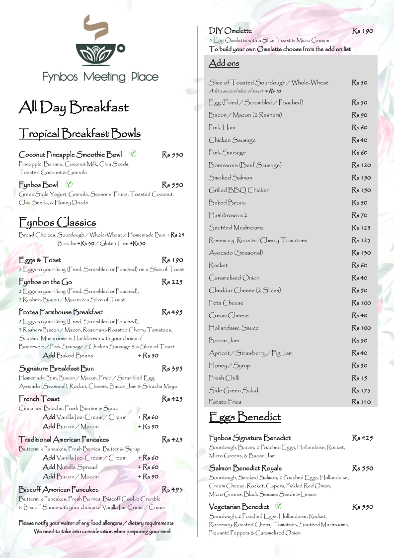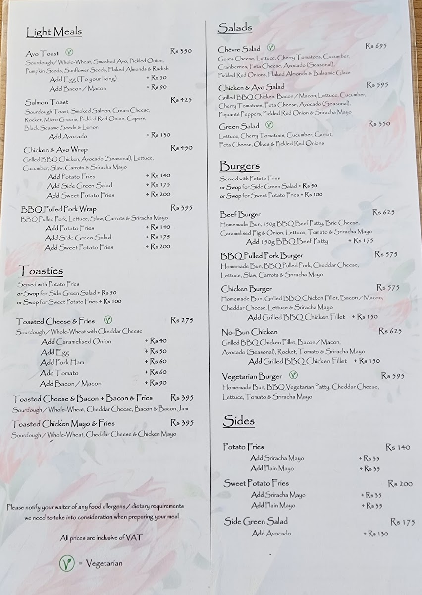 The menu at Fynbos Meeting Place offers a relaxed café-style experience, focusing on simple yet thoughtfully prepared dishes and comforting drinks. It’s the kind of place where you can settle in with a warming cup of coffee or fresh smoothie anytime during the day, whether you’re starting your morning or looking for a light lunch.